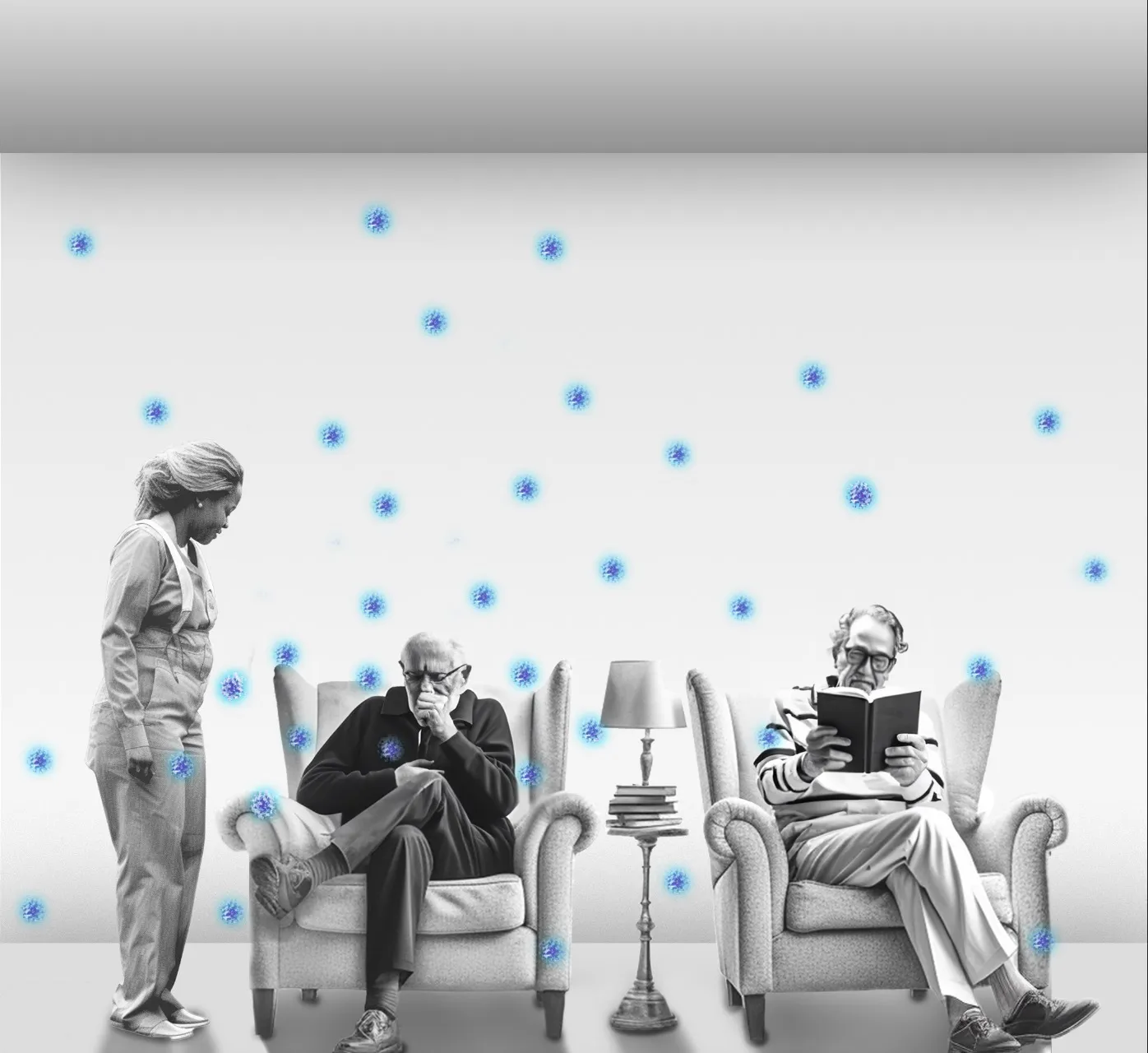 We use a novel form of human-safe UV light that disinfects in real-time, with people in-room, while complying with regulatory requirements.
